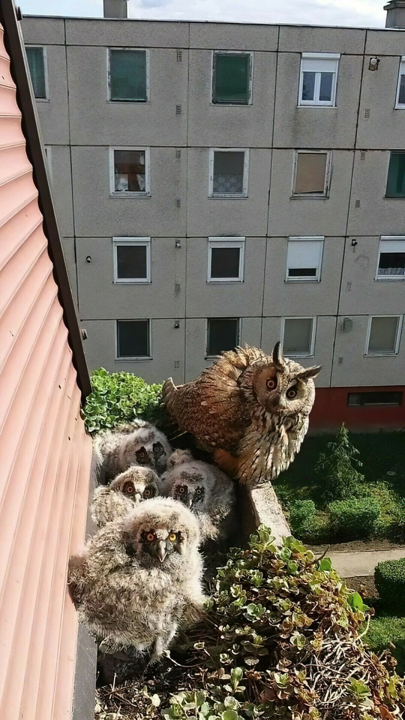 Сова со своими малышами любопытно осматривает городские достопримечательности