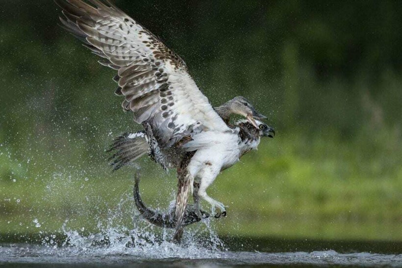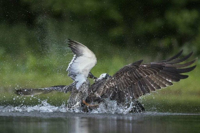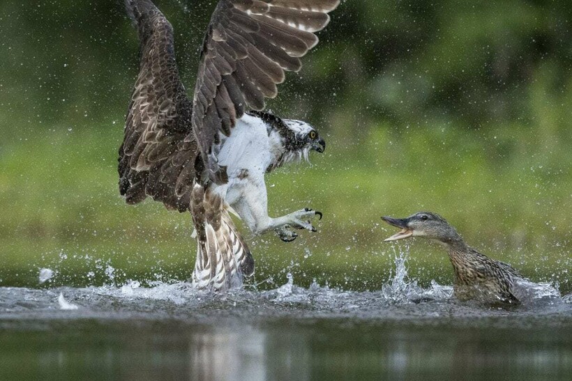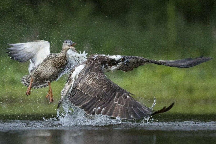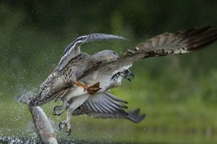 Скопа является прирожденным рыболовом, и в тот момент присмотрела в воде себе на обед форель. Выследив добычу, птица решила приземлиться прямо на воду, но встретила неожиданный отпор. Фотограф был поражен начавшимся на озере противостоянием. Обыкновенная утка кряква агрессивно кидалась на скопу, и той даже пришлось выпустить из цепких лап добычу, чтобы успеть унести ноги. К слову, здесь мы покажем вам видео еще одной невероятно зрелищной схватки: в ней одновременно участвуют питон, медоед и два шакала.