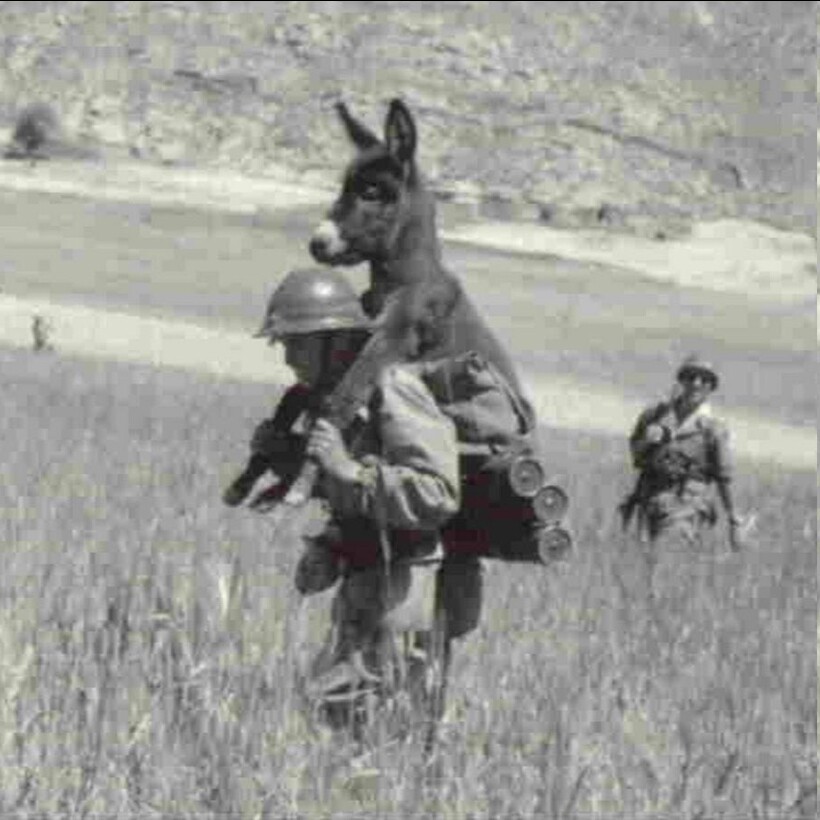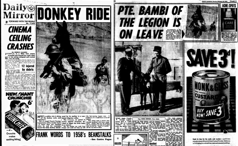 Вообще, в прошлом данный кадр был весьма популярным и даже печатался в газетах. Сделан он был летом 1958 года в Алжире. На нем ослика несет солдат 13-й полубригады Иностранного легиона. Голодное и обессиленное животное, на счастье, было случайно найдено военными. Они пожалели его и решили выходить. За привлекательную внешность и выразительный взгляд ослик получил кличку Бемби. Необычный живой талисман вскоре окреп и освоился, и всюду ходил за солдатами. Он выпрашивал их пайки и даже пару раз попадал под обстрелы. В конце концов военные все-таки решили оставить его на одной из баз, чтобы не подвергать риску. С того момента дальнейшая судьба ослика никому не известна. В те времена ослы и мулы часто проживали рядом с солдатами, помогая им перетаскивать грузы. К слову, в нашем предыдущем посте мы рассказывали о том, почему американские фермеры продают свое оружие и покупают ослов.