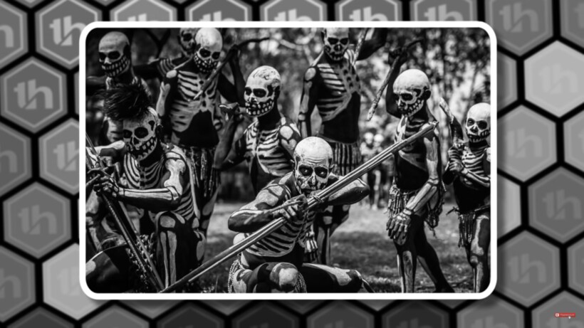 Раскрашивание тел в виде костей — древняя традиция племени чимбу. Это племя существует уже сотни лет, но первый контакт с цивилизацией случился у них относительно недавно. В 30-х годах прошлого столетия исследователи обнаружили племя со странными рисунками на теле. Откуда же взялась традиция притворяться скелетами? У чимбу есть легенда о том, что в древности существовал лесной злой дух, который пожирал людей. Находчивые члены племени решили сами претвориться духами, и теперь злой дух их не трогает.