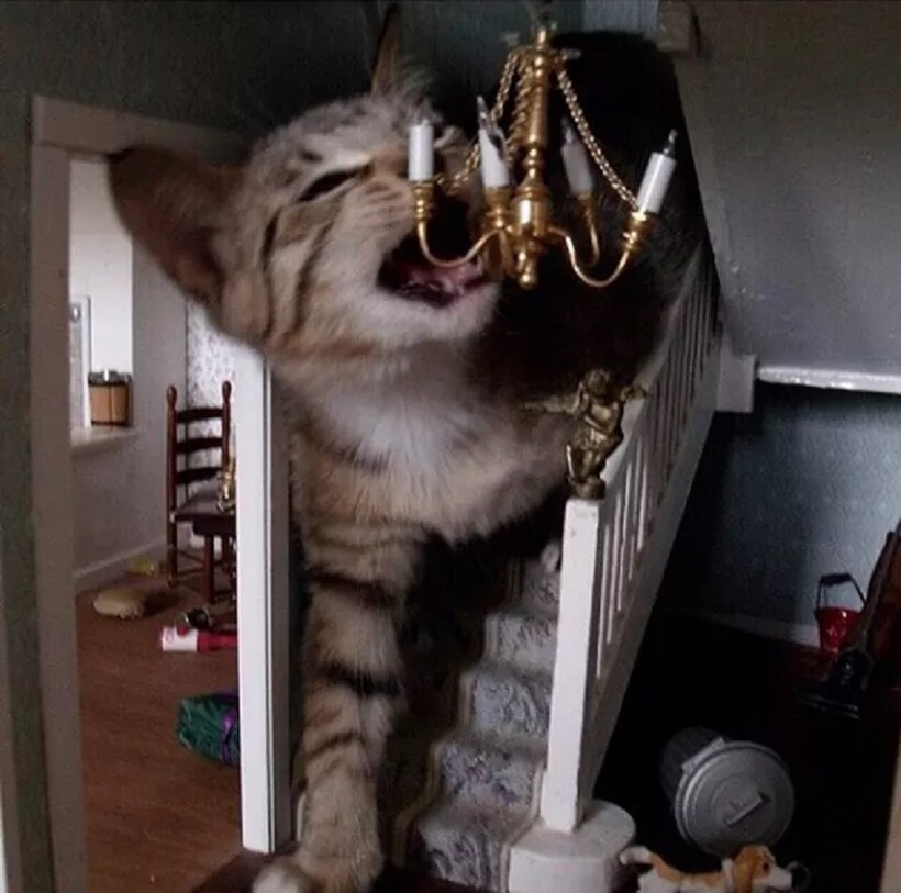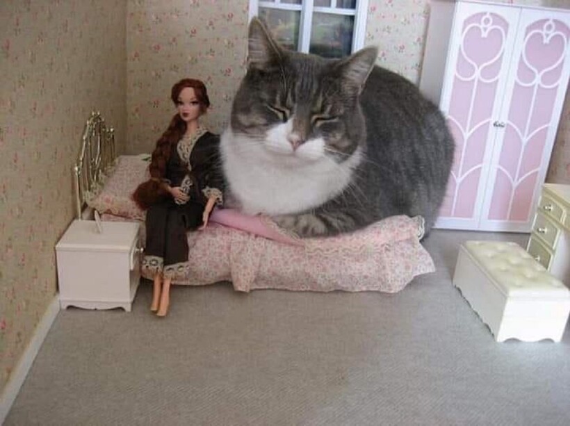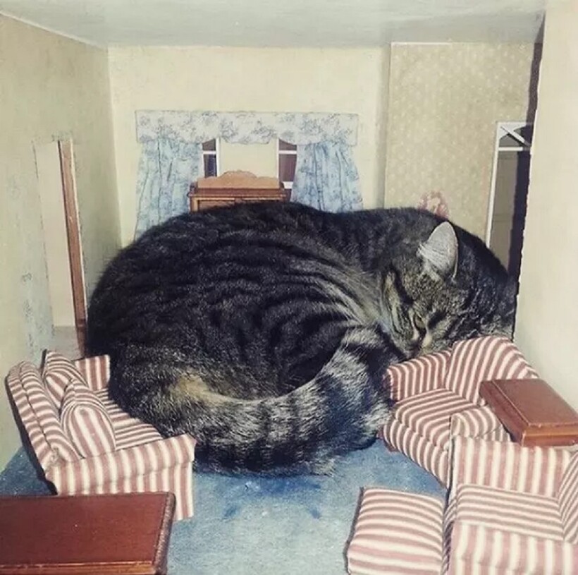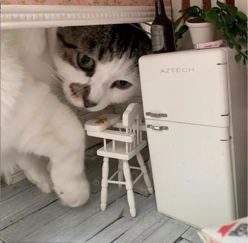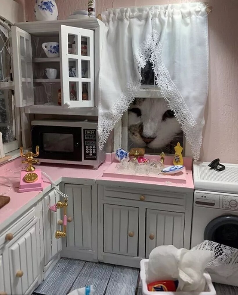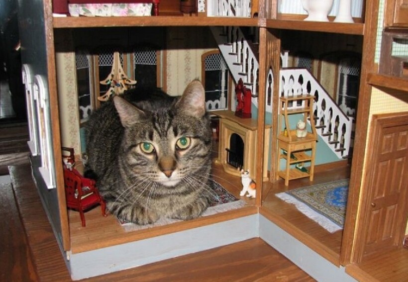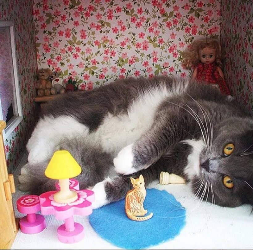 В таких сжатых, но реалистичных пространствах, хвостатые мурлыки смотрятся как слоны в посудной лавке, что только вызывает улыбку. Кстати, это отличный пример того, как бы выглядели кошки у нас дома, будь они и правда размерами с небольшого слоника. Кстати, а вы знаете, почему самый дорогой кукольный домик стоит несколько миллионов долларов?