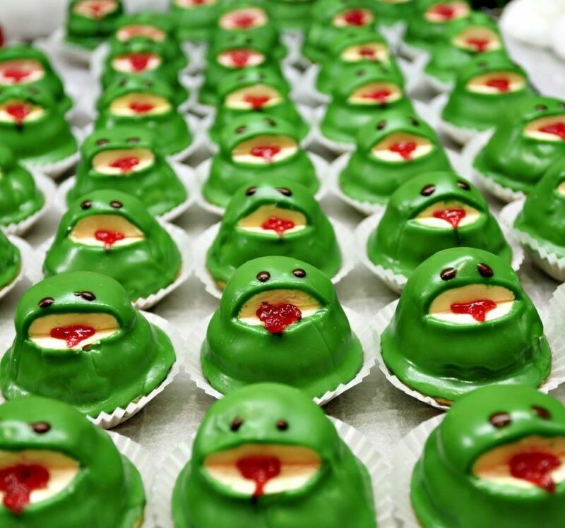 Речь идет не о реальных лягушках, а о маффинах в форме лягушек. Эти кексики горячо любимы в Южной Австралии, где они и были сделаны впервые. Сейчас приготовление в основном автоматизированное, но сначала фрог-кексы выпекались вручную. Тело лягушки — это твердая бисквитная основа, а внутри джем. Сначала делали только в зеленых оттенках лягушек, а позже появились желтые, розовые и других всевозможных цветов съедобные прыгуны.