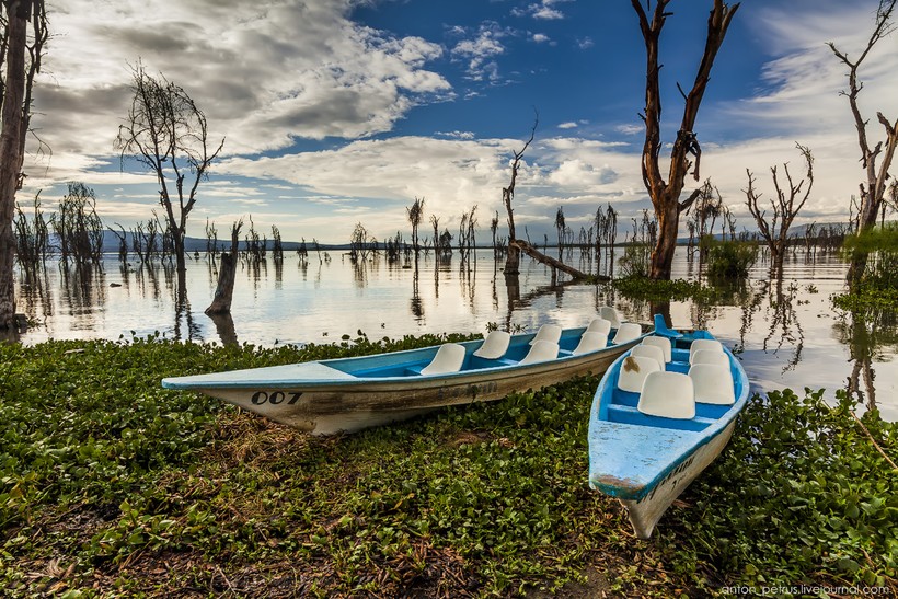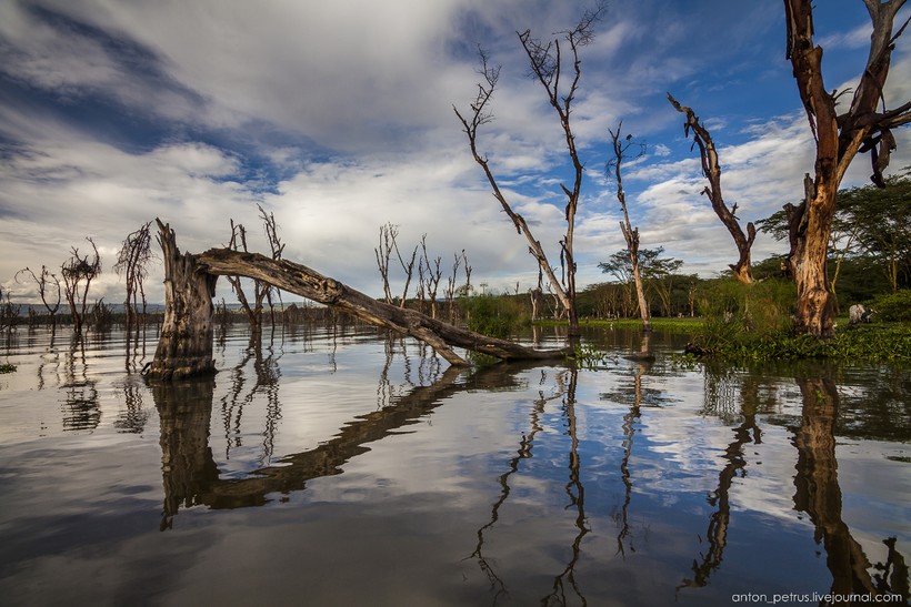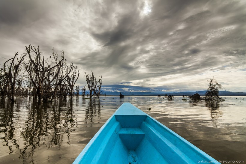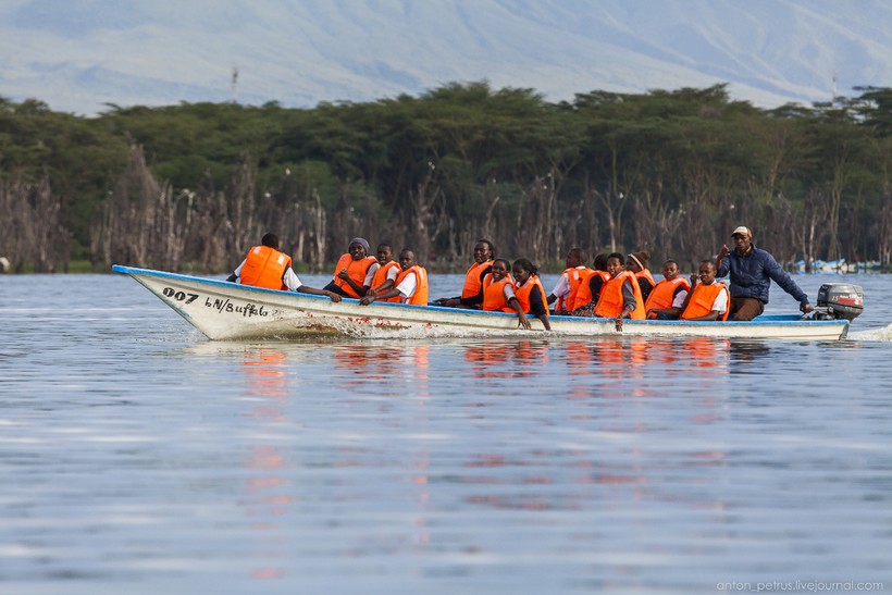 Наша лодка цвета бирюзы плавно рассекала темны воды Найваши. Очень живописное место, с деревьями в воде — вот она, пейзажная локация! На закатик бы там! Но после захода солнца на берег выходят «мото» — местные так бегемотов называют. И эти жруны жрут всю ночь траву. А если подойти по-ближе — растопчут.