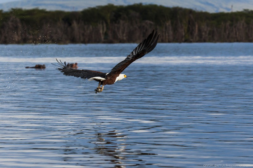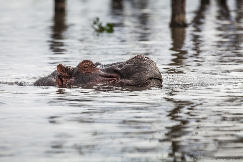 Самый правильный способ познакомиться с фауной озера — взять катер в аренду. Практически все кемпы на берегу занимаются организацией экскурсий, в нагрузку к катеру вам выдадут местного миго — водителя-экскурсовода. Он знает все «рыбные» места и покажет, как приманить местного орла-рыболова. Собственно не успели мы отплыть от берега, как сразу же увидели бегемотов. Сонные ребята позевывали в воде и не обращали на нас внимания.