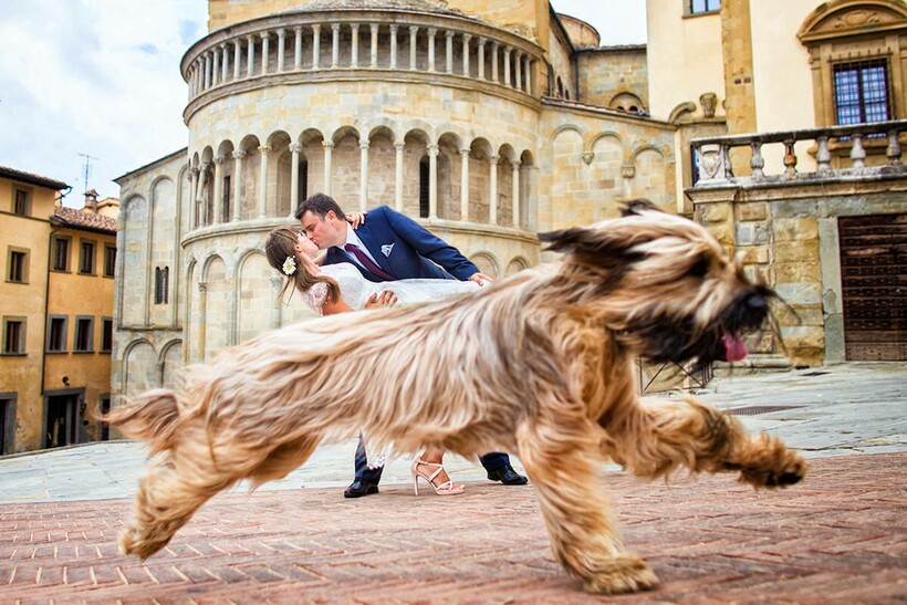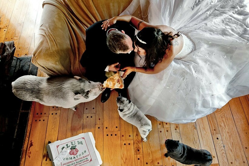 Стремясь к уникальности, молодожены то и дело подбирают для своих свадебных фото особенные и романтичные пейзажи, но все равно их снимки в большинстве своем похожи друг на друга. Изредка портреты счастливых гостей и жениха с невестой разбавляют любимые домашние питомцы. Однако как раз с появлением на съемке незваных животных фото и становятся оригинальными, живыми и по-настоящему неожиданными. Самые забавные из таких моментов ждут вас в нашей подборке.