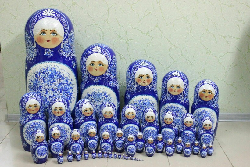 Эта коллекция, включающая в себя полсотни фигурок, считается одной из самых больших в мире. Размер самой большой из них превышает 50 см, а самая маленькая даже чуть более 3 мм. Внешний вид кукол выполнен в синих и белых цветах, которые являются символичными для российского государства, так как эти цвета ассоциируются с холодами и снегом. Да и сами матрешки будто укутаны в теплые одежды, чтобы не замерзнуть. Помимо румяных лиц, взгляд приковывают витиеватые узоры, украшающие центральную часть фигурок. Роспись исключительно точно передана на каждой из кукол, ведь даже на самой маленькой можно заметить мельчайшие завитушки и крохотные детали.
