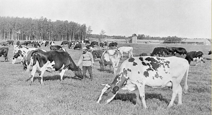Рогатый породистый скот в одном из богатых колхозов. СССР, Ленинград, 30-е годы 20 века.