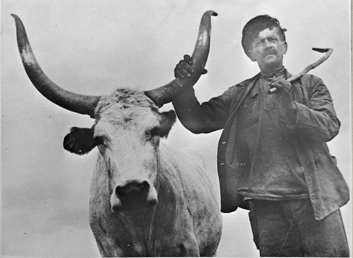 Колхозник с призовым быком в богатом колхозе. СССР, 30-е годы 20 века.