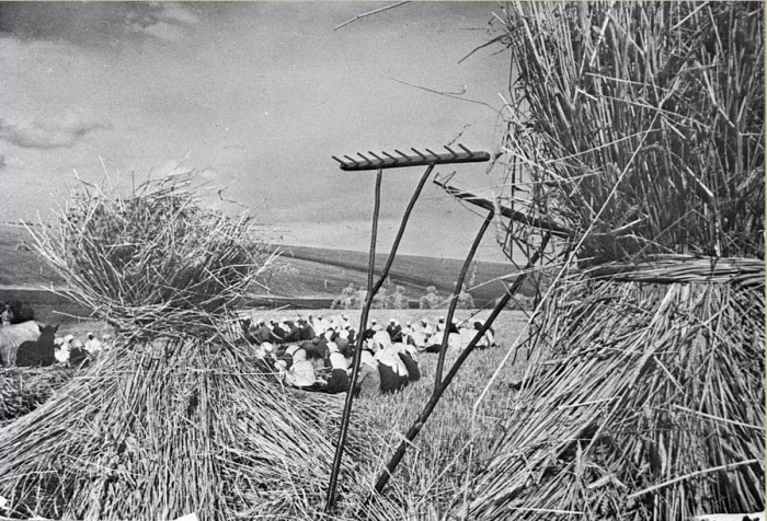 Обеденный перерыв во время сбора урожая. СССР, Украина, Киевская область, 30-е годы 20 века.
