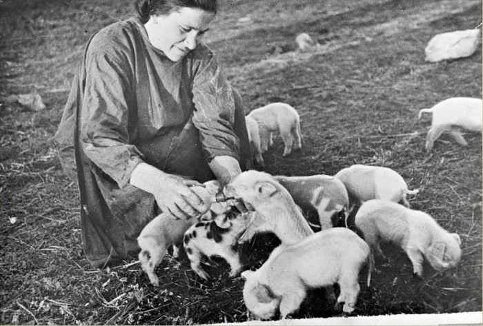 Сельская женщина кормит утром поросят. СССР, Северный Кавказ, Миллерово, 30-е годы 20 века.