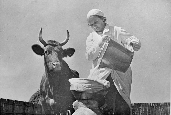 Фильтрование молока для коров на молочной ферме. Жена председателя Григоренко. СССР, 30-е годы 20 века.