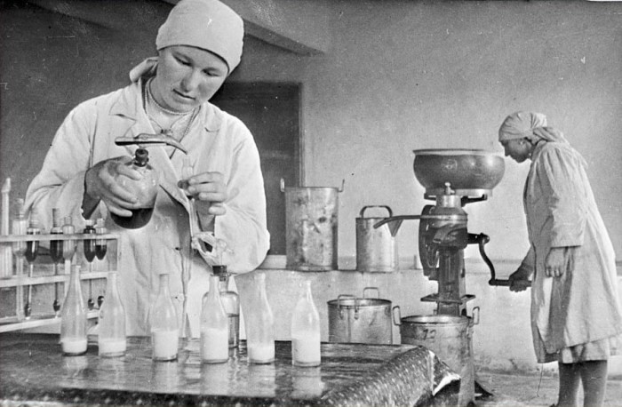 Проверка качества молока заведующей колхозной молочной фермой. СССР, Украина, Чапаевск, 30-е годы 20 века.