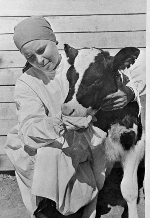 Женщина вытирает морду теленку после кормления. СССР, 30-е годы 20 века.