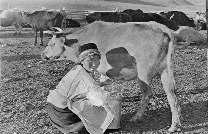 Доение коров. СССР, Восточная Сибирь, Ойротия, 30-е годы 20 века.