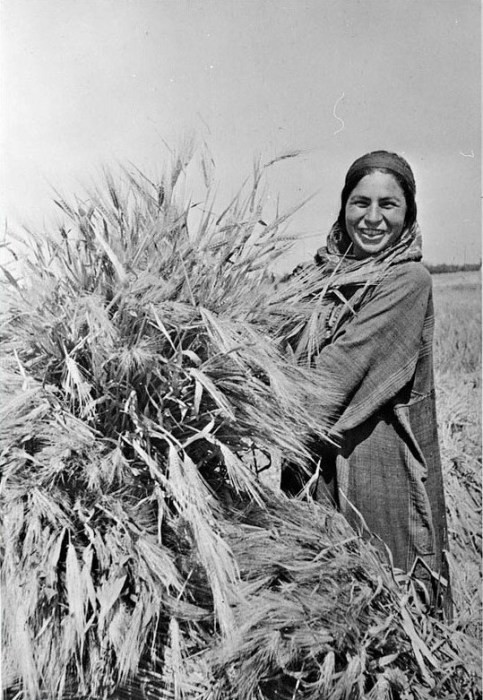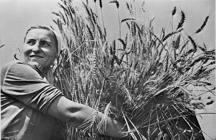 Женщина с недавно собранной пшеницей. СССР, 30-е годы 20 века.