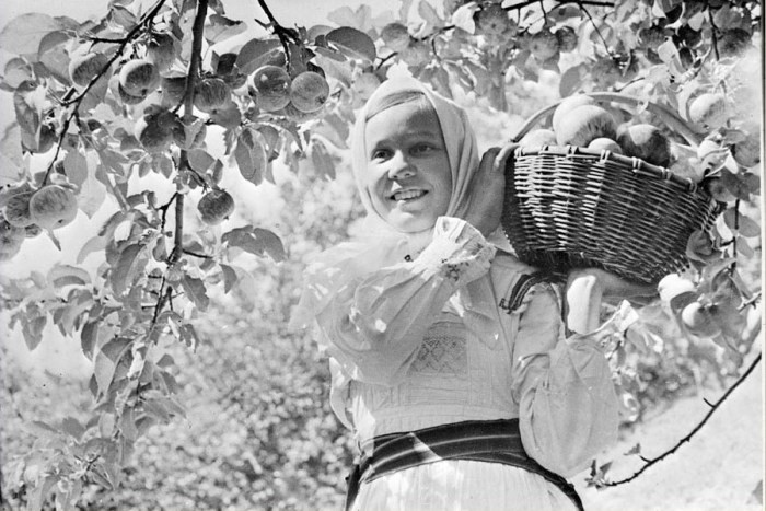 Девушка с недавно собранными яблоками. СССР, Марийская автономная область, колхоз «Аврора», 30-е годы 20 века.