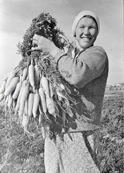 Маруся Сухова во время сбора морковки, выращенной в колхозе. СССР, Горьковская область, 30-е годы 20 века.