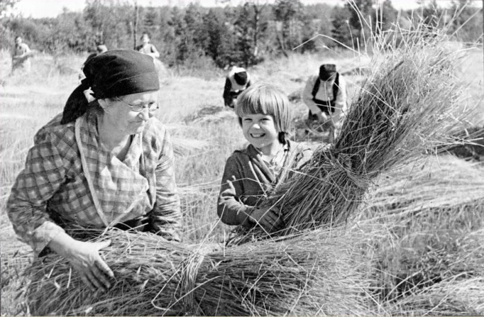 Пожилая колхозница с внучкой во время сбора урожая. СССР, 30-е годы 20 века.