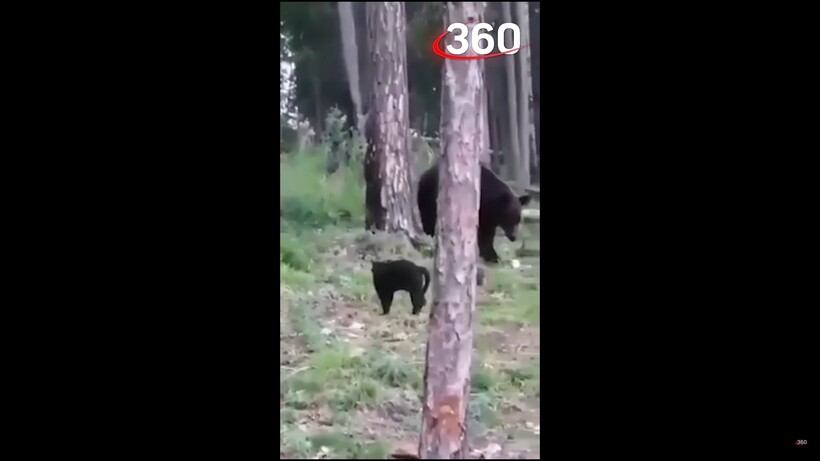 Домашний любимец по кличке Василий отдыхал на природе вместе со своими хозяевами. Кажется, на пикник решил заглянуть и медведь, однако ревнивый кот не захотел делиться вкусным горячим шашлыком с диким зверем. Он угрожающе выгнул спину и громко зашипел. Хозяин леса в это время пытался подойти к своему сопернику с разных сторон, стучал лапой по дереву, будто привлекая к себе внимание. Но кот был непоколебим: он стоял на одном месте, продолжая держать оборону.