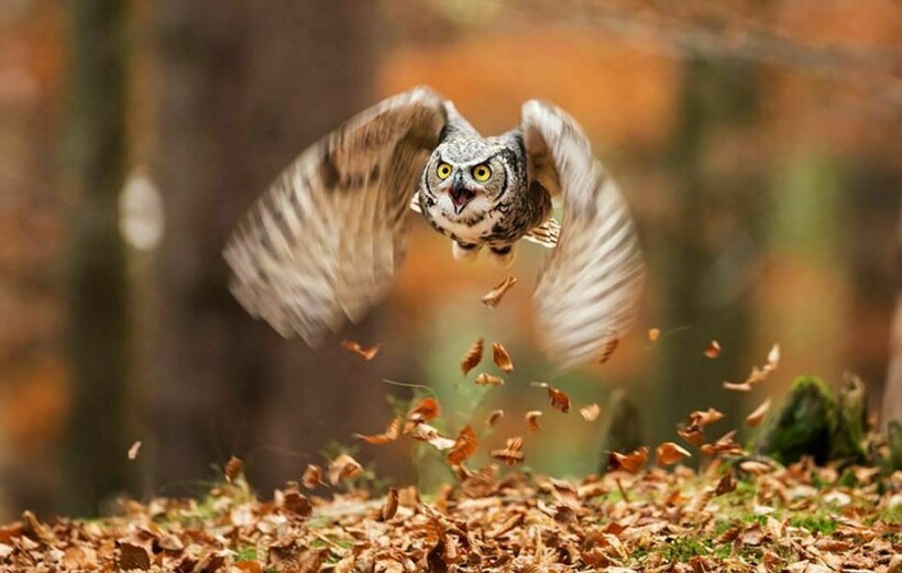 Эта сова явно только что вышла от психолога, который отлично замотивировал ее на целый день. Сова уверенно шагает к своей цели и не замечает на пути никаких преград.