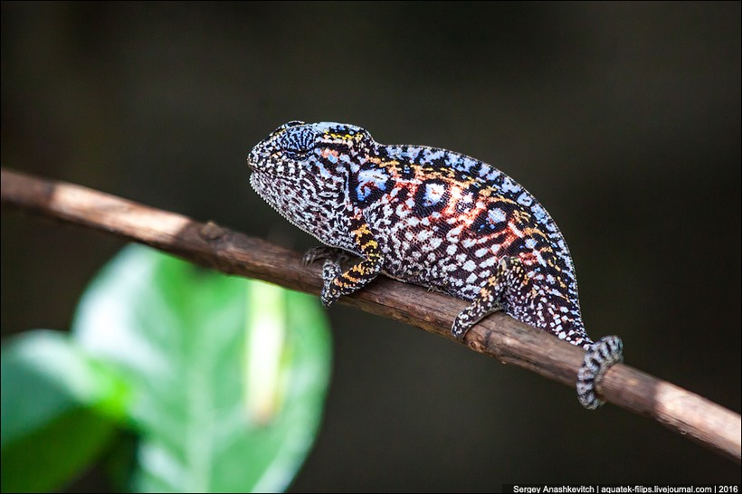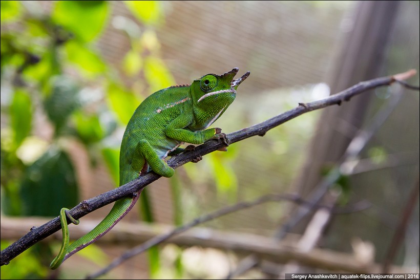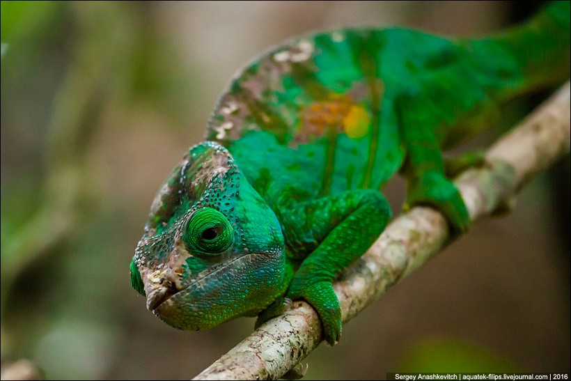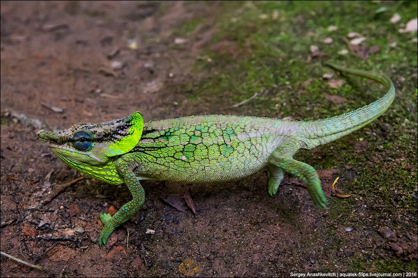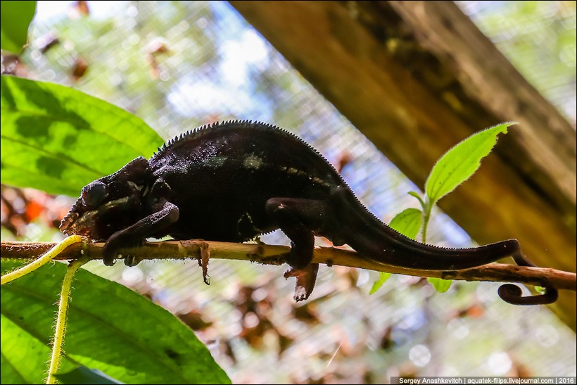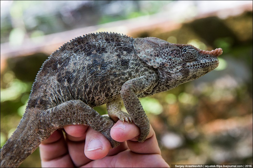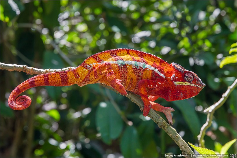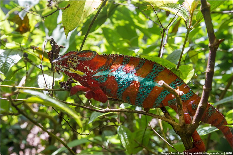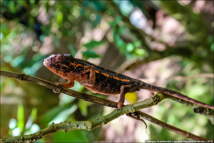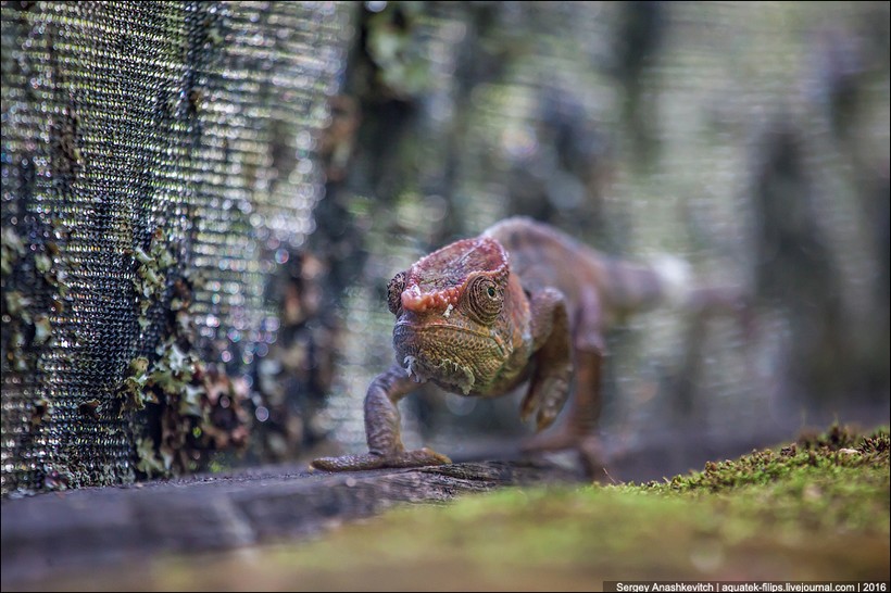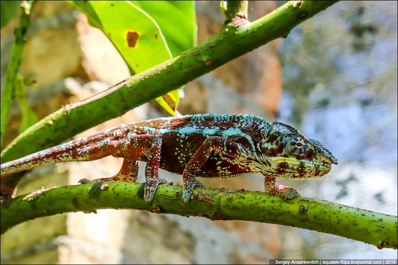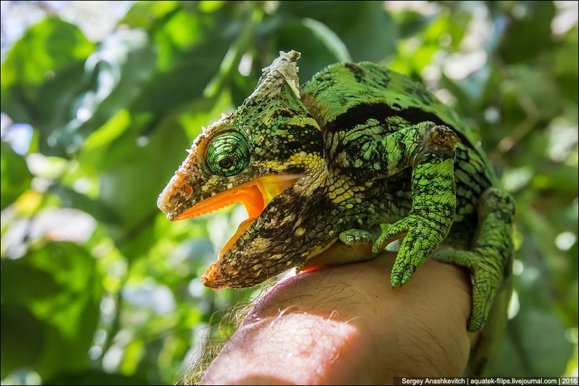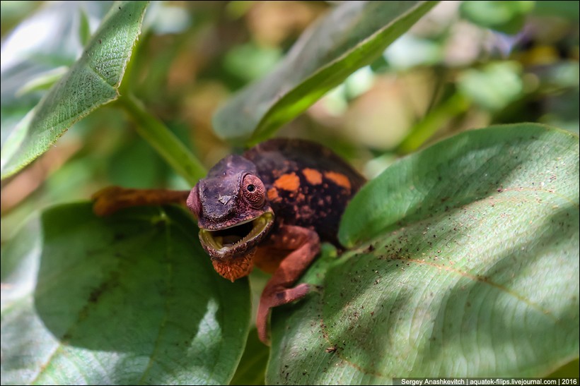 Кстати, пантеровый хамелеон часто встречается в местах обитания людей и не боится их. Например, во время съемки среди кустарников, может запросто забраться к вам на плечо или на голову)