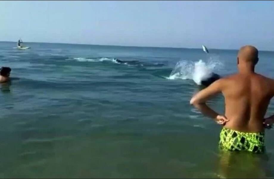 Оказалось, что дельфины охотились на рыб и забрели на мелководье. Они кружили вокруг добычи, пытаясь загнать ее в ловушку, чтобы съесть. Но необычным в этой ситуации оказалось то, что на берегу выстроились любопытные туристы, которые снимали данный процесс на видео. Вдруг, в один момент, рыба выскочила из воды настолько высоко, что угодила прямо в одну из снимающих видео туристку.