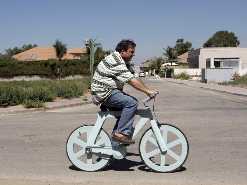 Инженер и дизайнер из Израиля создал велосипед из картона и резины. Весит такая конструкция всего 9 килограммов, а колеса транспортного средства невозможно проколоть, поскольку они сделаны из резины. Картонный велосипед способен выдержать вес до 220 килограммов и стоит порядка 12 долларов.