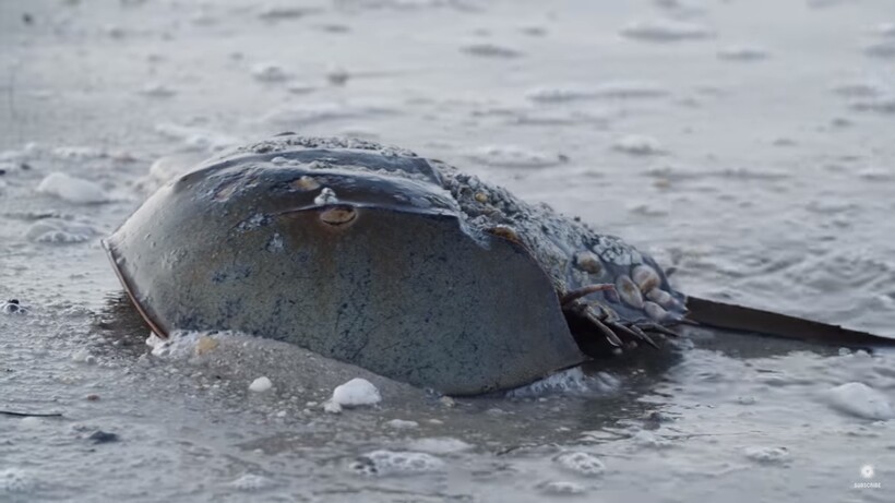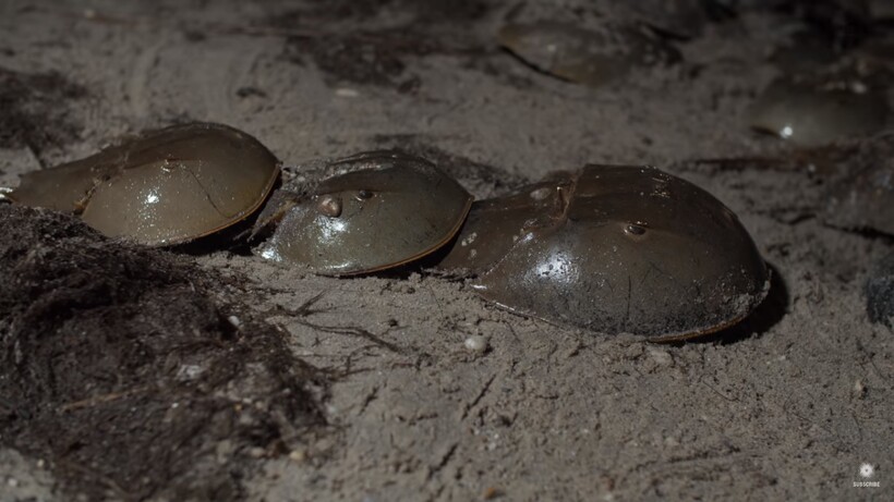На первых же кадрах — нежные малыши в прозрачных яйцах. Это икринки мечехвостов, которые готовятся войти в этот мир. Все началось 2 недели назад, когда их родители вышли из глубины соленого моря, чтобы дать потомство. Тогда миллионы крабов, словно по звонку, собираются вместе, растягиваясь группами по всему восточному побережью Америки, от штата Мэн до Мексиканского залива. Первыми появляются самцы, размером с блюдце, и ждут самок, которые намного крупнее, примерно с суповую тарелку. Самцы цепляются за самок и происходит процесс оплодотворения.
