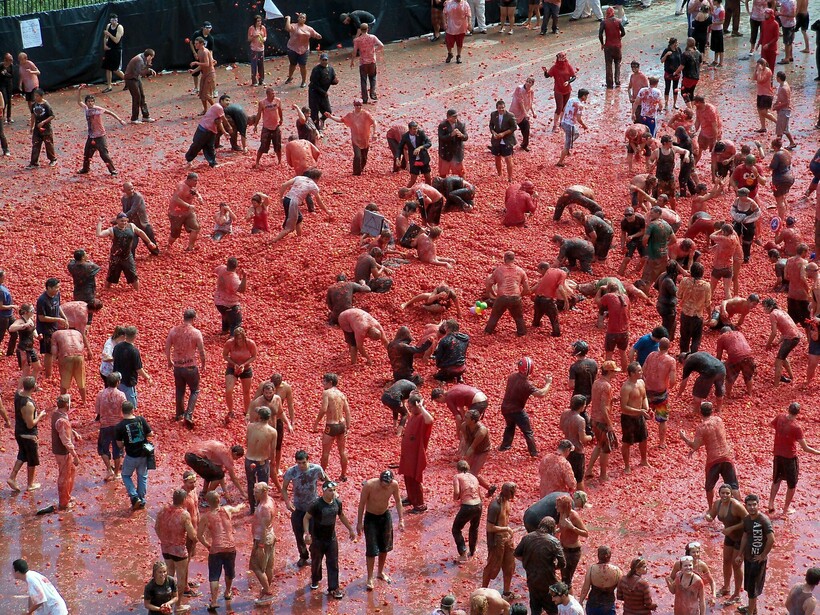 В Средние века кидались продуктами уже в осужденных преступников. Кстати, опять-таки не помидорами, потому что в то время европейцам этот овощ был незнаком, его привезут позже из Америки на корабле испанских колонизаторов. Подробнее об истории помидоров можно узнать здесь. А достаточно распространенными помидоры станут так и вовсе к середине XVIII столетия. Кстати, в незадачливых актеров во времена того же Шекспира было принято бросать тухлые яйца. Поэтому даже великий драматург был вынужден включать в свои произведения сцены, не позволяющие зрителям «заскучать». И начать бросаться в бедных исполнителей. Правда, порой «обстрел» производили не искренне недовольные увиденным зрители, а специальные люди — клакеры, от услуг которых порой зависел успех любой премьеры. Но об этом мы уже писали ранее. Если говорить об относительно современном периоде этой неоднозначной традиции, то можно вспомнить «Битлз». Потому что им «обстрелы» тоже были привычны, правда, куда более приятные. Потому что к ним на сцену словно из рога изобилия сыпались мармеладки. Происходило это во время гастролей группы в Новом Свете. Но вернемся к помидорам. Начиная с 1945 года в Буньоле в Валенсии стал проводиться фестиваль La Tomatina, на котором каждый год радостные местные жители пополам с туристами закидывают друг друга тоннами помидоров в течение часа. Даже страшно представить, сколько продуктов изводится на это мероприятие, но оно не теряет своей популярности уже много лет.