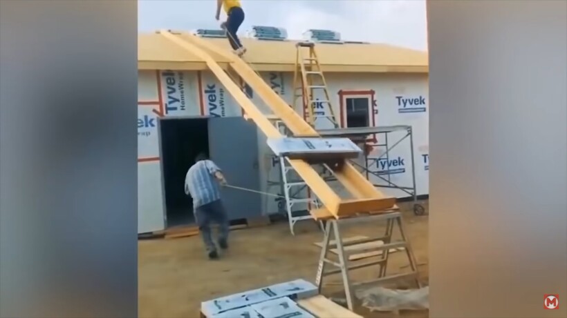 Строители, которые занимаются крышей, выполняют гораздо более тяжелую работу, чем те, которые работают, стоя на земле. Сложность работы с крышей заключается в том, что стройматериалы нужно сначала поднять наверх, а уже потом приняться за дело. Строители из видео ниже нашли способ решения этой проблемы. Они положили две большие доски, которые поднимаются на крышу, словно рельсы. По этим рельсам с помощью веревки гораздо проще перемещать материалы, необходимые для строительства. А какая самоделка показалась вам самой гениальной?