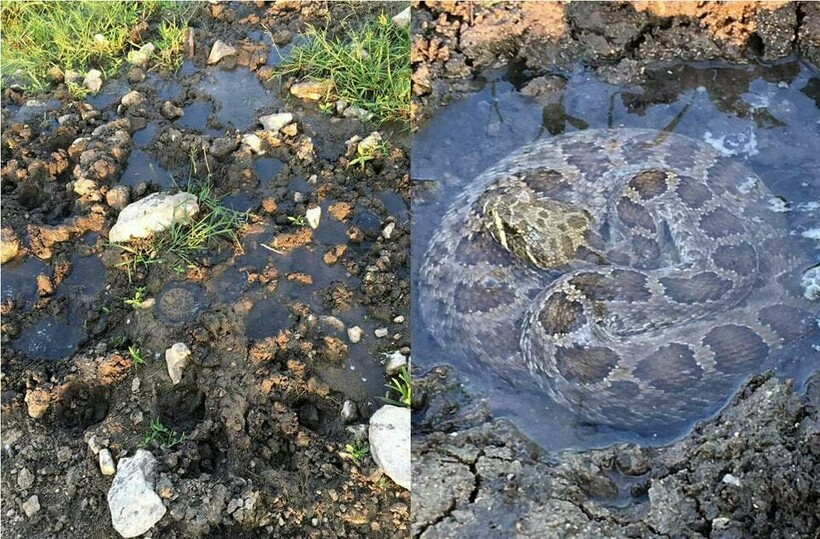 След от коровьего копыта стал прекрасным новым жилищем для змеи.