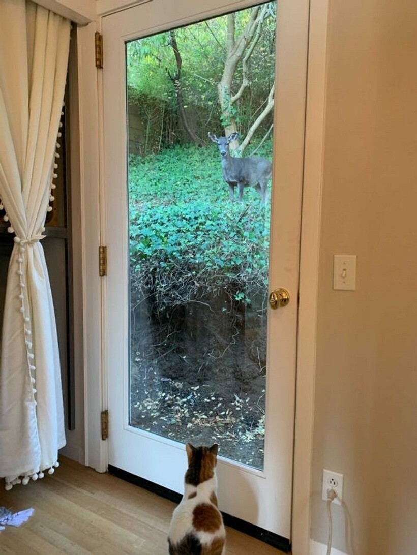 Лесные жители приходят в гости к частным домам ненадолго, но успевают обменяться приветствием с домашними питомцами. Олень и кот долгое время разглядывали друг друга.