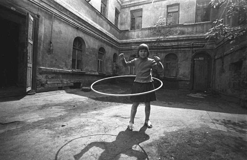 Особенность этих снимков в том, что в них каждый может увидеть себя. Так, эта девочка на фото воплощает в себе всех советских детей, которые тоже выходили во дворы поиграть со сверстниками в разнообразные игры, в том числе и покрутить обруч.