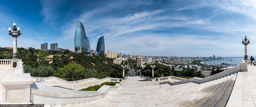 Лавочки, аттракционы с колесом обозрения, кинотеатры, фонтаны, магазинчики и кафе. Приморский бульвар — волшебный город в городе длиной в 16 километров. Вечером жизнь здесь бьет ключом, тысячи бакинцев неспешно гуляют, любуясь Каспием. Если вы влюбленный-мечтатель, это место вас покорит огнями и видами. Если вы расчетливый математик — покорит цифрами. На реконструкцию набережной мэрия Баку потратила в 2008 году 500 миллионов долларов.