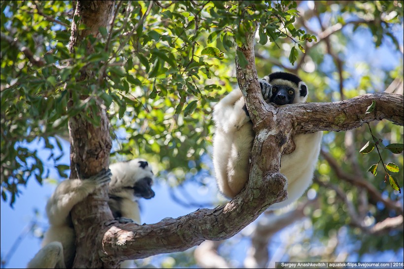 Живут сифаки на деревьях, удобно устроившись на ветках и в высоких кронах.