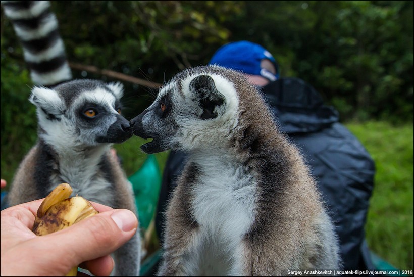 Ради бананов лемуры запрыгивают на плечи, забираются на голову и даже иногда, аккуратно свесившись с веток, пытаются выхватить из пальцев банан, который вы протягиваете совсем другому животному.
