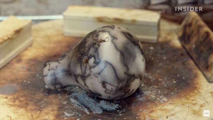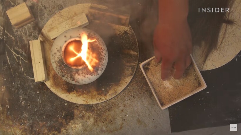 Эрик Луи показывает, как создается керамика. Все начинается с замешивания местной глины и заливки в формы, которые позволяют создать посуду с тонкими стенками. Когда глина застывает, мастер снимает форму и производит обжиг в печи, нагретой до 1200°С. Когда обжиг завершен, Эрик вынимает посуду и, пока она достаточно горячая, кладет сверху конские волосы для длинных узоров и древесную стружку для изменения цвета посуды. На раскаленной керамике дерево и грива вспыхивают огнем и оставляют темные очертания. Но на это есть всего пара минут — потом керамика остынет.