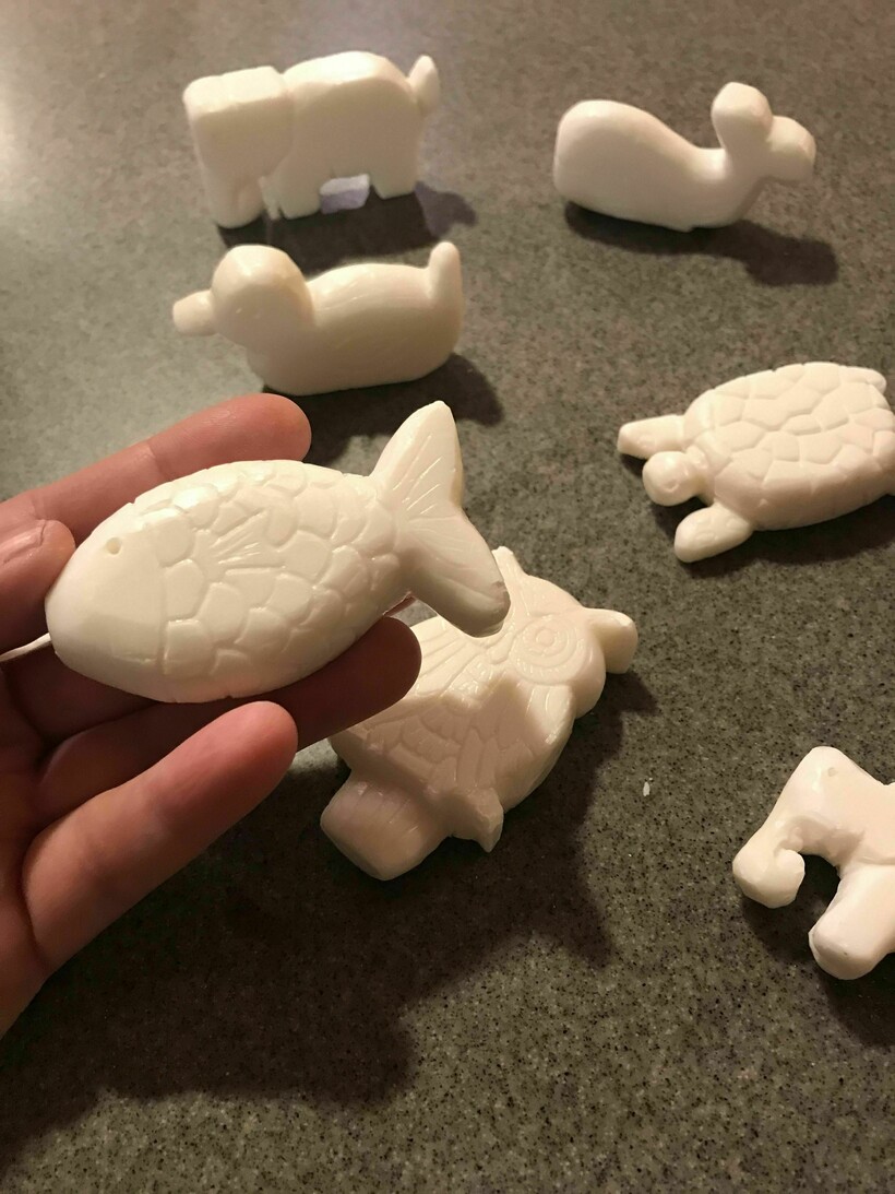 Используя лишь пластиковую ложку и ручку можно вырезать вот таких зверушек. Они сделаны из куска обыкновенного отбеливающего мыла.