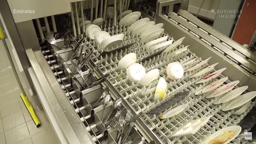 Помимо одноразовой посуды, которая утилизируется сразу, требуется разобрать и помыть керамическую и стеклянную посуду, в ней подается еда для пассажиров первого и бизнес-класса. В день сотрудники моют по 3 000 000 предметов от ложек до подносов и термосов. Благо, огромные промышленные посудомоечные машины справляются с этой задачей быстро и качественно. Затем вся чистая посуда отправляется в другой цех, где готовятся блюда.