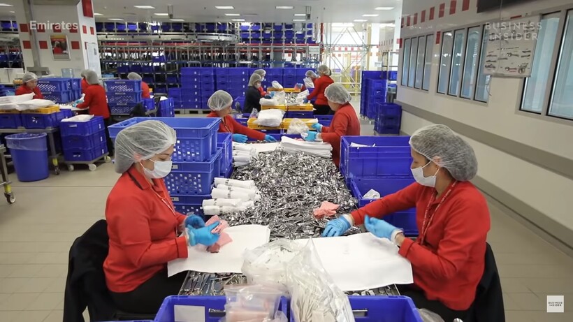 За год арабские авиалинии перевозят по 50 000 000 человек, которые очень любят поесть. К примеру, по статистике за 2018 год, было съедено 72 миллиона булочек, 60 тонн клубники, 190 тонн лосося и почти 1500 тонн картофеля. Как же проходит каждый день компании EFC? Оказывается, все начинается не с готовки, а с уборки: сотрудникам требуется разгрузить все тележки с остатками пищи и грязной посудой с прибывающих рейсов, чтобы потом загрузить их вновь.