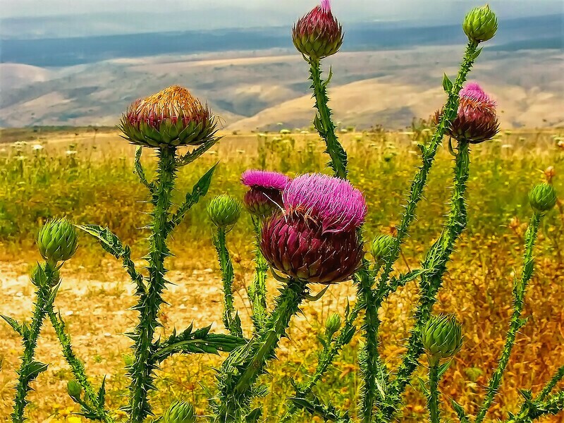Чертополох ведет себя точно так же, как все представители перекати-поля. После созревания плодов он отрывается от корней и в форме шара несется на многие километры вперед. А еще он довольно пожароопасный. Сколько бы сил ни было затрачено на борьбу с ним, пока все попытки тщетны.
