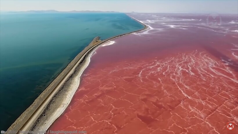 Природа не перестает нас удивлять: озеро, разделенное железной дорогой на красное и синее, не исключение. Это еще одно чудо света, но ему есть рациональное объяснение. Разные концы водоема отличаются глубиной и уровнем солености, поэтому вода имеет разные оттенки. Невероятное зрелище, которое можно оценить только с высоты птичьего полета, и эту возможность нам дал дрон. О дронах-голубях можно узнать здесь.