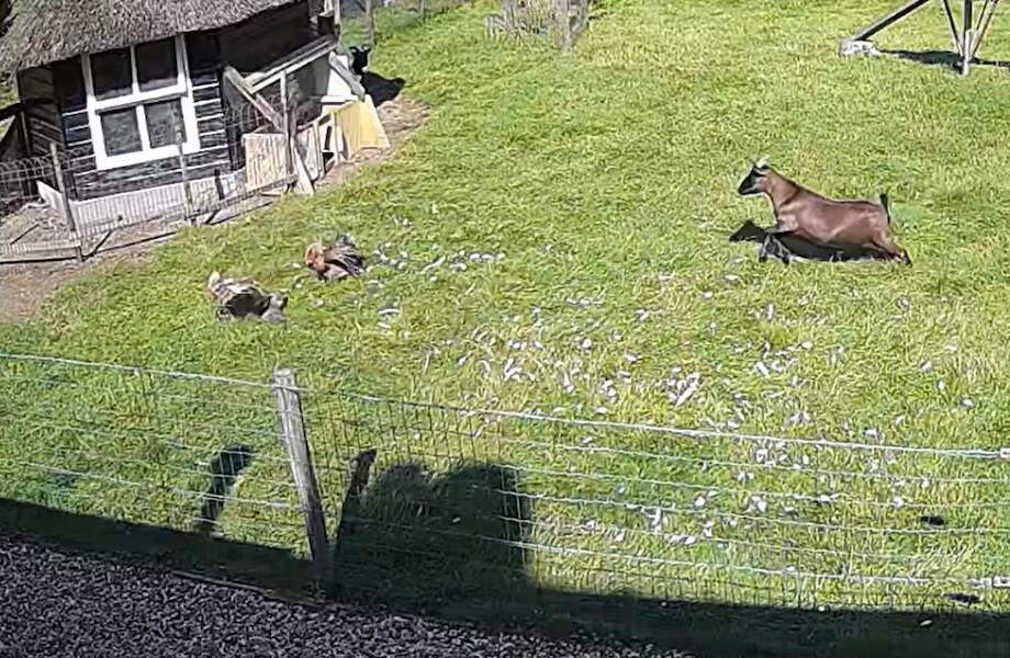 Ниже можно увидеть, как курица мирно прогуливается по зеленой траве, и в этот момент ее идиллию портит хищник. Ястреб накинулся на птицу и попытался утащить ее. Перья летят во все стороны — кажется, птице уже не спастись, но помощь пришла откуда не ждали. Защищать птицу кинулся петух, а затем в драку ввязывается козел. Вместе им удалось отогнать хищника и спасти соседку. Ястреб улетает без добычи, а курица отделалась испугом и незначительными травмами.
