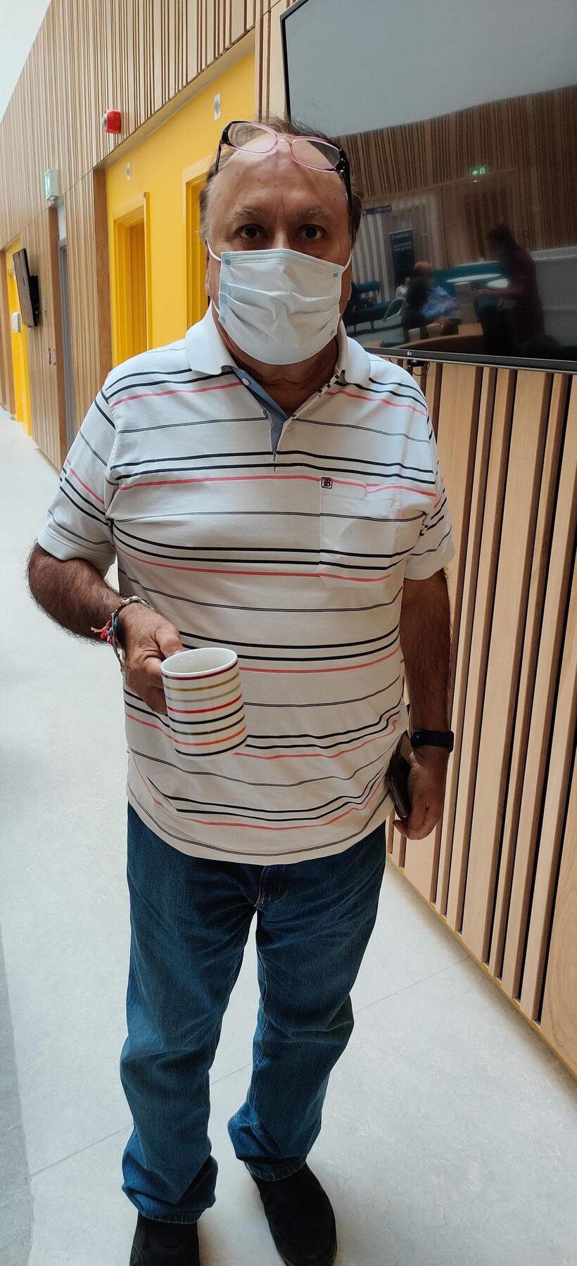 Больничная кружка отлично подошла к расцветке футболки мужчины