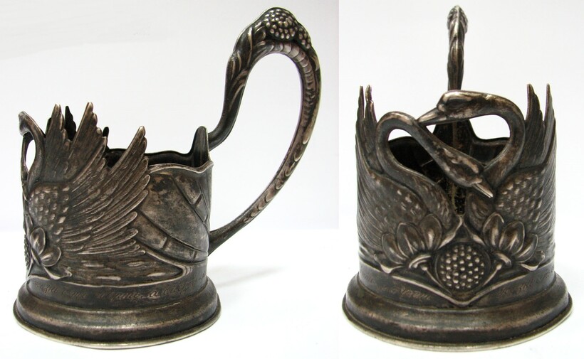 Такая привычная вещь для советских времен осталась только в поездах «РЖД» и в некоторых домах. Но особую ценность представляют подстаканники из столового серебра с изображениями герба СССР или московского Кремля. Вот такой серебряный подстаканник с лебедями 1930-х годов оценивается в €650.