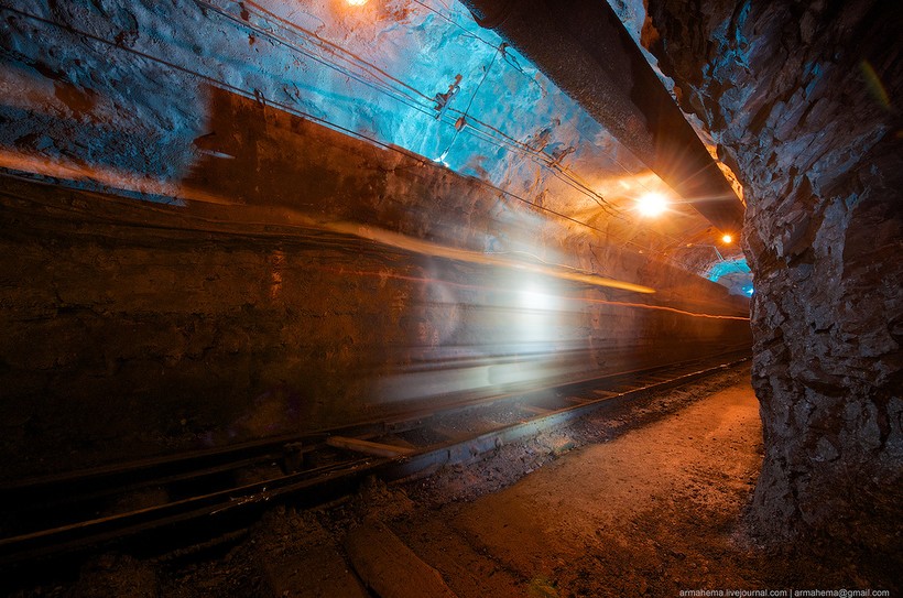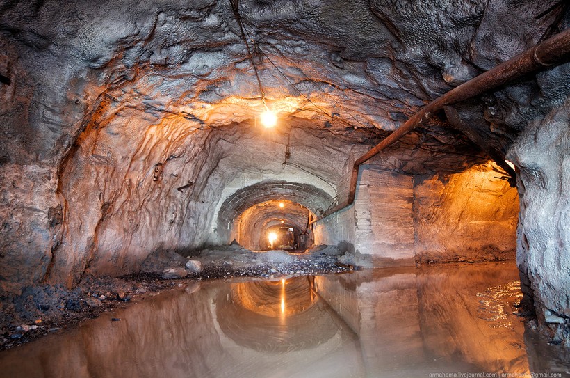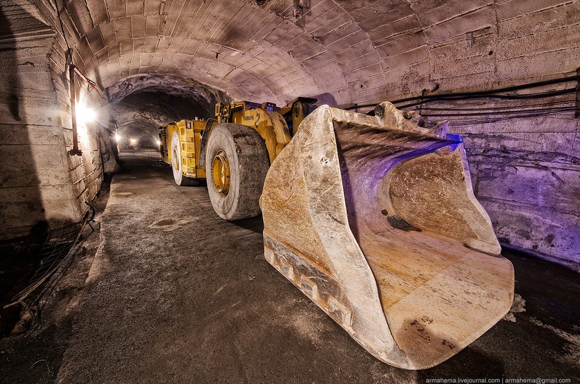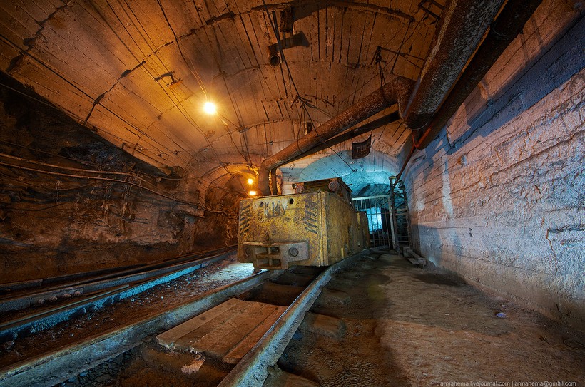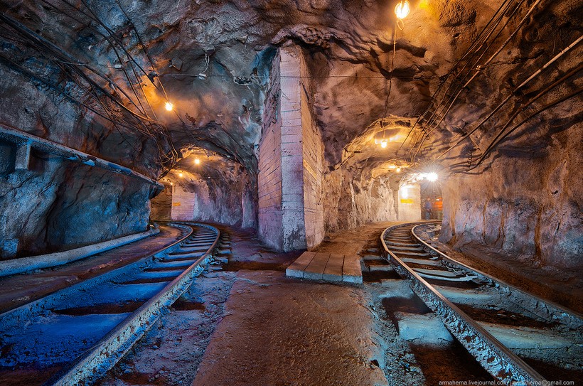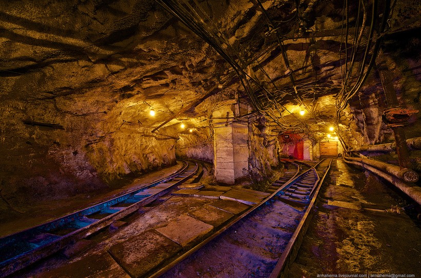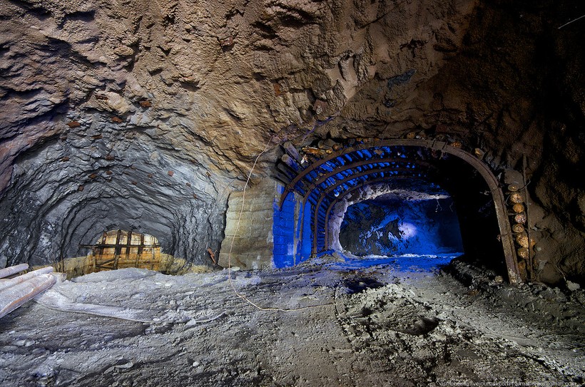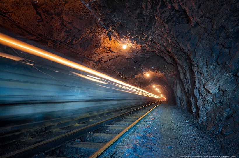 Для отгрузки породы были пробиты длинные тоннели непосредственно в нижнюю часть карьера, проложена узкоколейка.