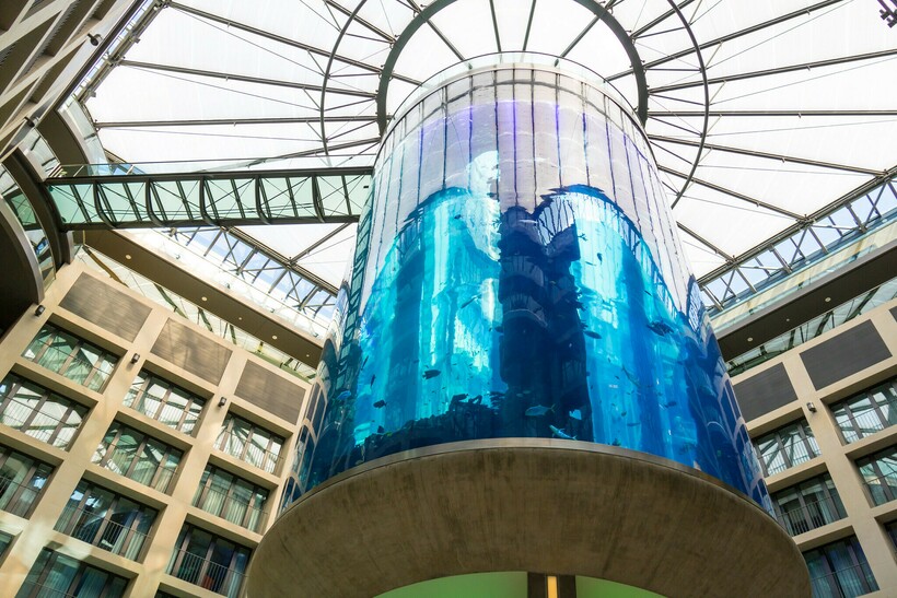 Уникален тем, что он самый большой цилиндрический аквариум в мире. Его высота примерно с 8-этажный дом, а объем — 900 000 литров. Находится он в столице Германии. Дайверы обслуживают аквариум с тропическими рыбками прямо на глазах восхищенных гостей, а чтобы попасть в ресторан под стеклянной крышей, можно проехаться по такому же прозрачному лифту сквозь этот цилиндр с рыбами. Причем и лифт-то немаленький: вмещает 48 человек.