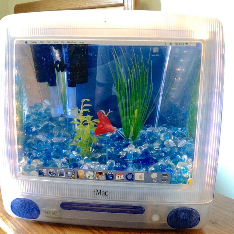 Для ценителей Apple дизайнер Джейк Хармс придумал своеобразные и редкие аквариумы. Он помещает их в старые компьютеры. Кстати, российские умельцы переделывают старые ламповые телевизоры под домашние аквариумы. Знаете, как устроить аквариум прямо в чашке? Мы писали об этом здесь.
