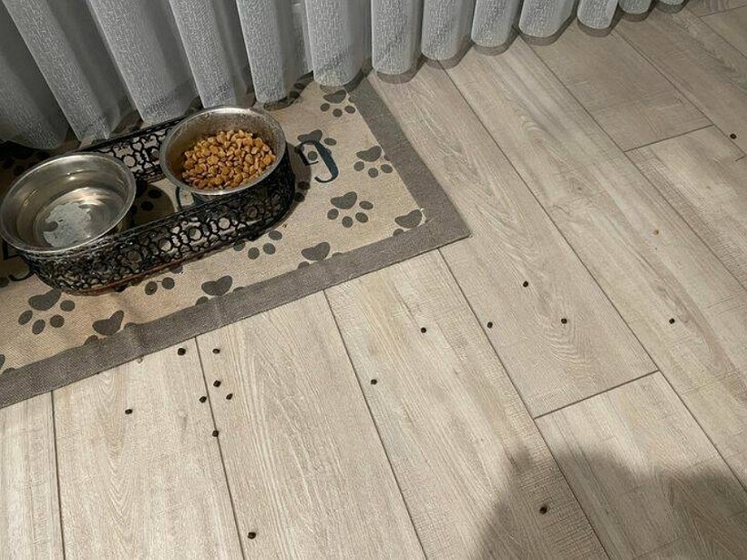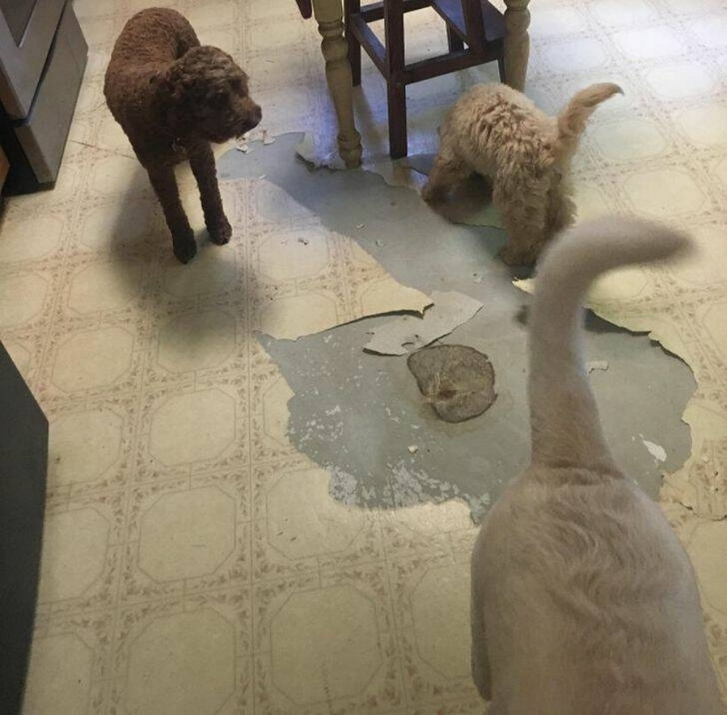 Всего одна ночь понадобилась питомцам, чтобы обрадовать хозяина срочным ремонтом полового покрытия на кухне.