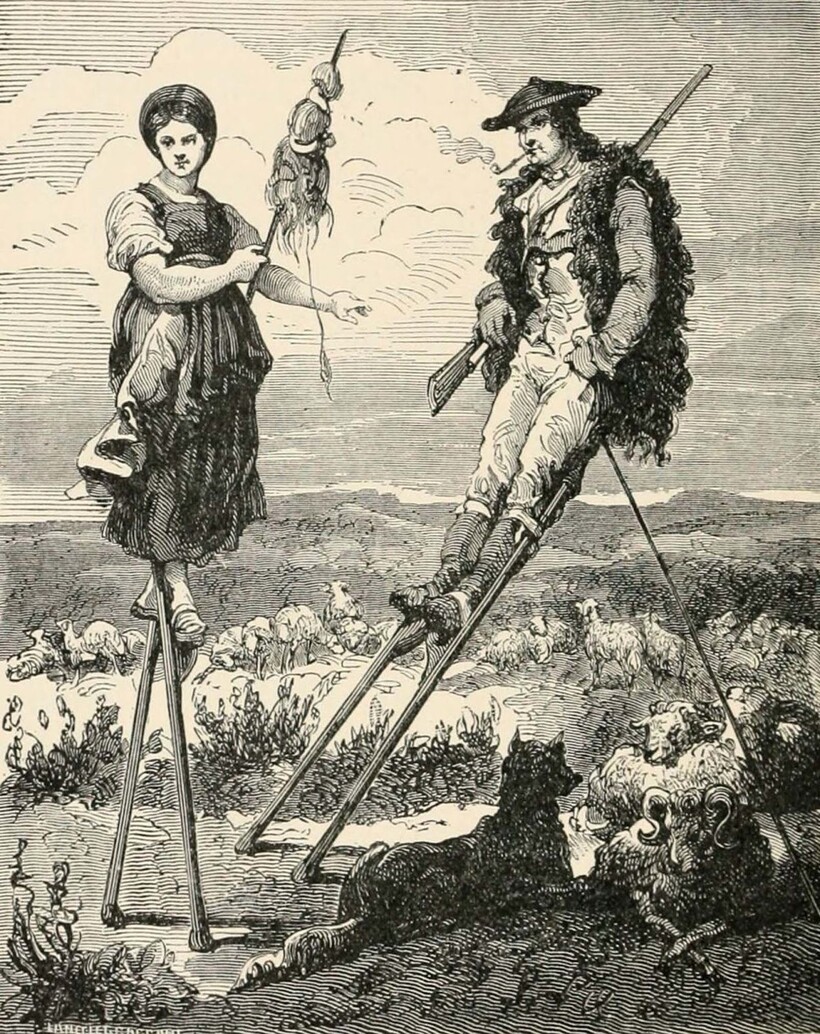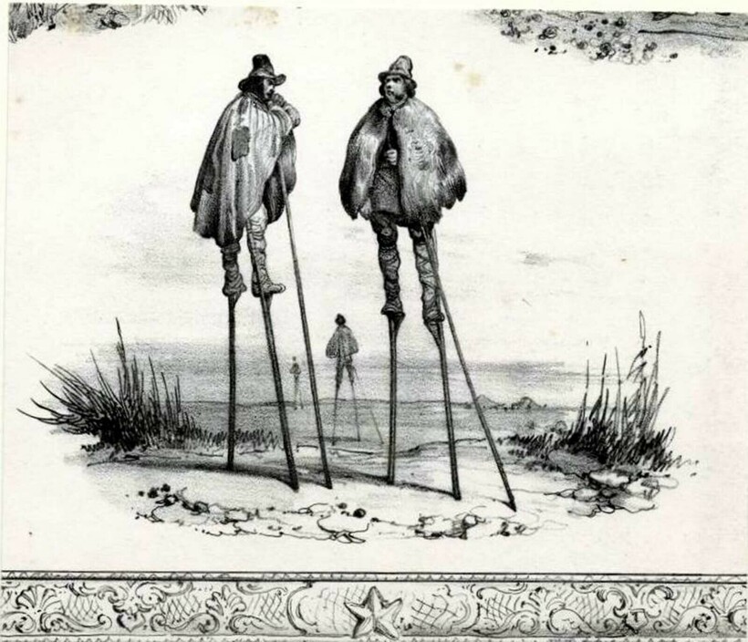 На самом деле ходули известны еще с древности, но в большинстве уголков мира они были лишь развлечением. В Ландах все жители умели ходить на ходулях, этому обучали с детства. Ходули для французов становились словно продолжением их самих: мы даже как-то рассказывали, как один француз отправился в путешествие на ходулях в Москву. А что, вполне неплохой выбор «транспорта» для XIX века, когда не было нормальных дорог, согласитесь.